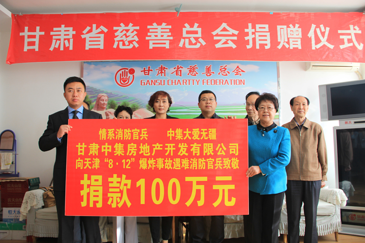 2015年8月12日23時30分,天津濱海新區(qū)國際物流中心發(fā)生重大爆炸火災(zāi)事故,造成重大人員傷亡。甘肅中集房地產(chǎn)開發(fā)有限公司總經(jīng)理周啟濤獲悉后,決定為在本次事故中犧牲的消防官兵及其家屬捐款100萬元,用于幫助犧牲消防官兵家屬善后事宜的處理,以盡一份甘肅企業(yè)的慈善愛心。