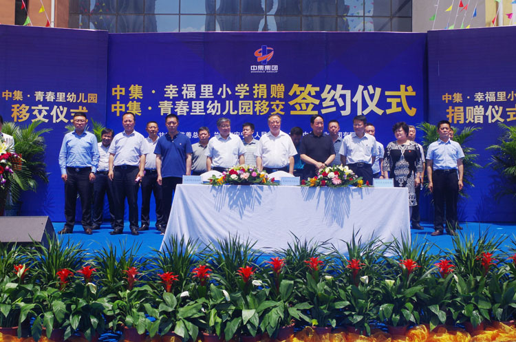 2017年6月22日下午14時,甘肅中集實業(yè)集團有限公司通過甘肅省慈善總會,向蘭州市安寧區(qū)人民政府捐贈價值1.02億元中集•幸福里小學暨中集•青春里配建幼兒園移交儀式在中集•幸福里小學操場隆重舉行。甘肅省原人大常委會副主任、甘肅省慈善總會會長朱志良,甘肅省原民政廳黨組書記、廳長、甘肅省慈善總會常務(wù)副會長梁國安,甘肅省教育廳副廳長趙 凱,蘭州市人大常委會副主任孫曉鋼,蘭州市人民政府副秘書長淡漢榮,安寧區(qū)區(qū)委書記王 方及安寧區(qū)區(qū)委副書記、區(qū)長雒澤民攜安寧區(qū)委、區(qū)人大、區(qū)政府、區(qū)政協(xié)四大班子領(lǐng)導(dǎo),蘭州市教育局、蘭州市國土局、蘭州市規(guī)劃局、蘭州市房產(chǎn)局相關(guān)領(lǐng)導(dǎo)出席捐贈儀式,甘肅中集實業(yè)集團有限公司黨委書記、董事長周啟濤代表公司完成與安寧區(qū)人民政府捐贈及移交簽約。
