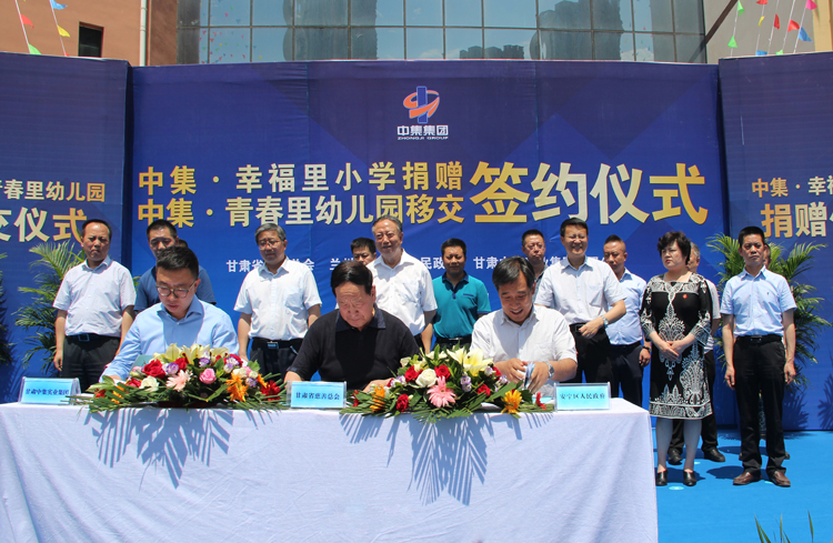 2017年6月22日下午14時,甘肅中集實業(yè)集團有限公司通過甘肅省慈善總會,向蘭州市安寧區(qū)人民政府捐贈價值1.02億元中集•幸福里小學暨中集•青春里配建幼兒園移交儀式在中集•幸福里小學操場隆重舉行。甘肅省原人大常委會副主任、甘肅省慈善總會會長朱志良,甘肅省原民政廳黨組書記、廳長、甘肅省慈善總會常務副會長梁國安,甘肅省教育廳副廳長趙 凱,蘭州市人大常委會副主任孫曉鋼,蘭州市人民政府副秘書長淡漢榮,安寧區(qū)區(qū)委書記王 方及安寧區(qū)區(qū)委副書記、區(qū)長雒澤民攜安寧區(qū)委、區(qū)人大、區(qū)政府、區(qū)政協(xié)四大班子領導,蘭州市教育局、蘭州市國土局、蘭州市規(guī)劃局、蘭州市房產(chǎn)局相關領導出席捐贈儀式,甘肅中集實業(yè)集團有限公司黨委書記、董事長周啟濤代表公司完成與安寧區(qū)人民政府捐贈及移交簽約。