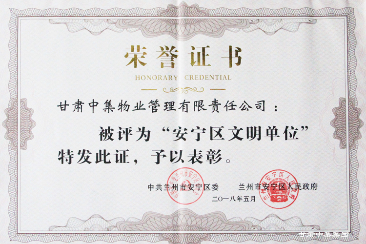 2018年5月14日下午,蘭州市安寧區(qū)委、蘭州市安寧區(qū)人民政府在安寧區(qū)政府第四會議室召開安寧區(qū)2017年度“文明單位”命名表彰大會。會上,甘肅中集物業(yè)管理有限責任公司被中共蘭州市安寧區(qū)委、蘭州市安寧區(qū)政府聯(lián)合命名并授予“文明單位”榮譽稱號。