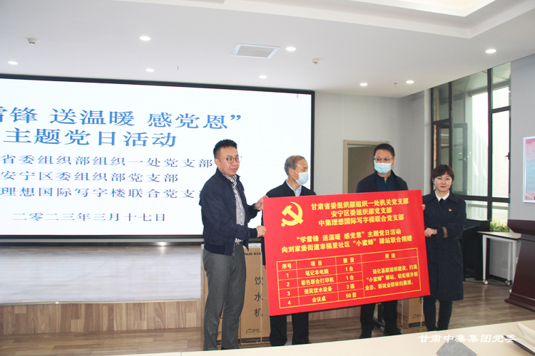 2023年3月17日,甘肅省委組織部組織一處黨支部、安寧區(qū)委組織部黨支部、甘肅中集集團黨委聯(lián)合開展“學(xué)雷鋒 送溫暖 感黨恩”主題黨日活動——向劉家堡街道幸福里社區(qū)“小蜜蜂”驛站聯(lián)合捐贈價值3萬余元的配套設(shè)施。