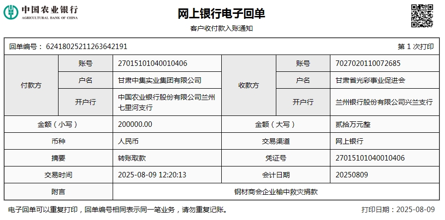 2025年8月9日,甘肅中集集團(tuán)捐資20萬元助力榆中山洪災(zāi)害救援及災(zāi)后重建;
